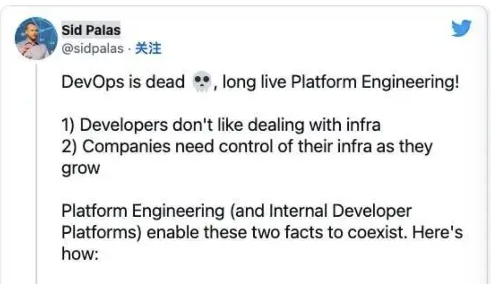 国外大神Sid Palas,一位专门做 DevOps 和 Cloud infra 相关工作的开发者,不久前发出的一条惊悚推特:DevOps is dead,long live Platform Engineering(DevOps已死,平台工程万岁!),引爆了开发者们的焦虑与愤懑。